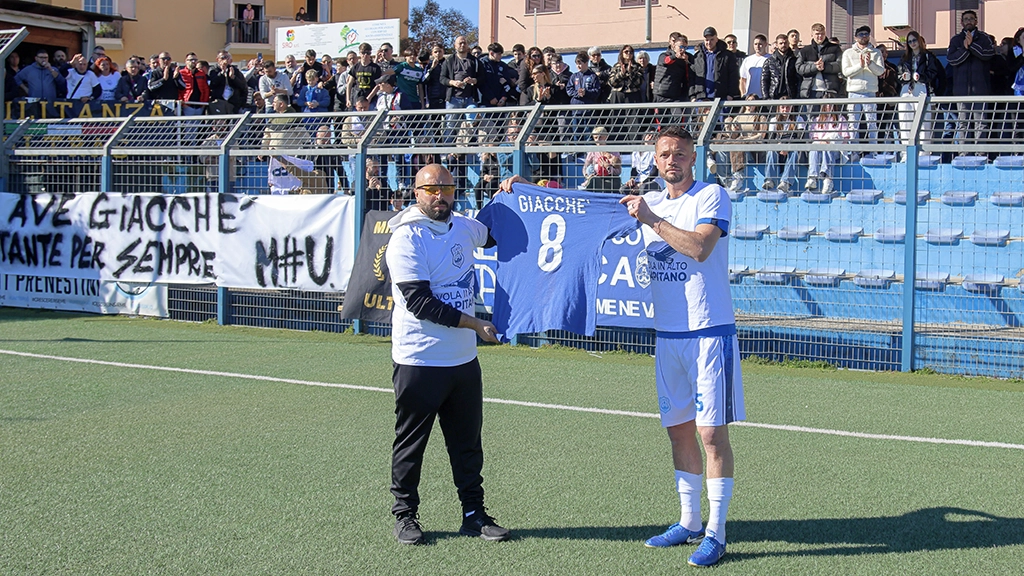 Sulle note de "I giardini di marzo" tutto il pubblico presente sugli spalti, gremiti da tantissime persone che si sono volute unire alla giornata celebrativa, ha reso omaggio all'ex capitano e tecnico del Città di Cave, ad ulteriore riprova dell'affetto da cui Giacchè era circondato. I suoi giocatori sono scesi in campo prima del fischio d'inizio con una maglia celebrativa con il numero 8 sulle spalle, mentre una targa ed un'altra maglia con il numero simbolo dell'ex mediano biancoazzurro sono stati consegnati ai suoi familiari. Attimi carichi di significato che hanno portato al culmine il momento dedicato al tecnico, il cui ricordo rimarrà indelebile tra la sua gente.