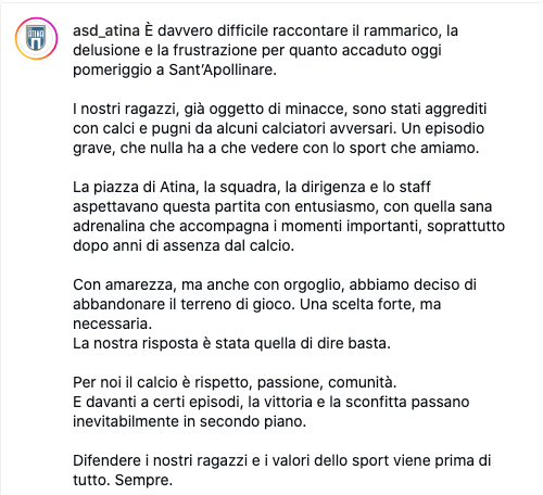 Secondo quanto riferito da un tesserato dell'Atina, infatti, "all'arrivo della squadra al campo l'accoglienza è stata molto poco amichevole da parte degli avversari. Sono addirittura arrivati dei colpi al volto del portiere e un tentativo di aggressione al capitano, difesosi con il proprio zaino prima di arrivare nello spogliatoio. Qui abbiamo provveduto a contattare le forze dell'ordine, che insieme al commissario di campo e all'arbitro sono giunte all'impianto circa un quarto d'ora dopo i fatti, non riscontrando nulla di irregolare". E nessuna volontà di sporgere denuncia da parte dei giocatori dell'Atina, come confermato da entrambe le parti. Una volta effettuato il riconoscimento da parte del direttore di gara, i giocatori ospiti hanno deciso di abbandonare l'impianto, con la tifoseria di casa "che ci ha invitati a ripensarci - prosegue la fonte ospite - per fagli godere la partita per cui erano venuti. Non essendo a conoscenza di quanto avvenuto, sono state rivolte frasi piuttosto colorite ai giocatori in uscita dai cancelli". I quali hanno però riferito di aver ricevuto solidarietà sui social una volta provveduto a spiegare le motivazioni del loro gesto.