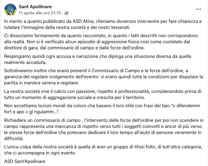 La società di casa ha provveduto immediatamente a rispondere, sempre tramite i social e con le parole del presidente Luca Di Roberto, raggiunto telefonicamente nella giornata di lunedì. Prendendo le distanze dalla ricostruzione fatta dagli avversari, i gialloblù hanno sottolineato come "il mancato riscontro da parte di forze dell'ordine e commissario di campo delle evidenze portate dagli avversari lasciavano prevedere condizioni valide per la disputa dell'incontro". Che già all'andata aveva vissuto momenti complicati, con due espulsioni tra le fila del Sant'Apollinare che avevano scatenato le proteste di squadra e tifosi, che hanno aspettato impazienti l'arrivo della gara di ieri. Gli striscioni che hanno accolto l'Atina al loro arrivo hanno reso l'idea dell'attesa che c'era intorno al big match, ma fin qui nulla da eccepire: fa parte dell'ambiente calcistico quando si ha a che fare con una tifoseria particolarmente vicina alle sorti della squadra.