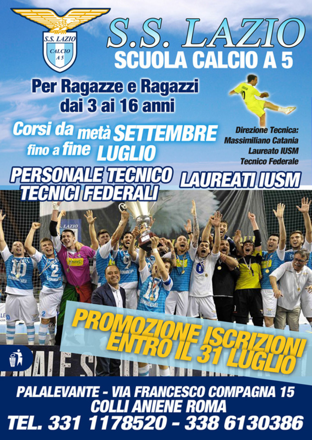 Il ritiro. Insomma, sta nascendo un Settore Giovanile di altissimo profilo, professionale e competente. Allievi e Giovanissimi cominceranno la loro stagione il 25 agosto e per le prime tre settimane verrà svolto un mini ritiro presso il Pala Levante. L'attività di base, invece, partirà il 15 settembre: a tal proposito, la S.S. Lazio Calcio a 5 comunica che verrà proposta una promozione per tutte le iscrizioni che arriveranno entro il 31 luglio.