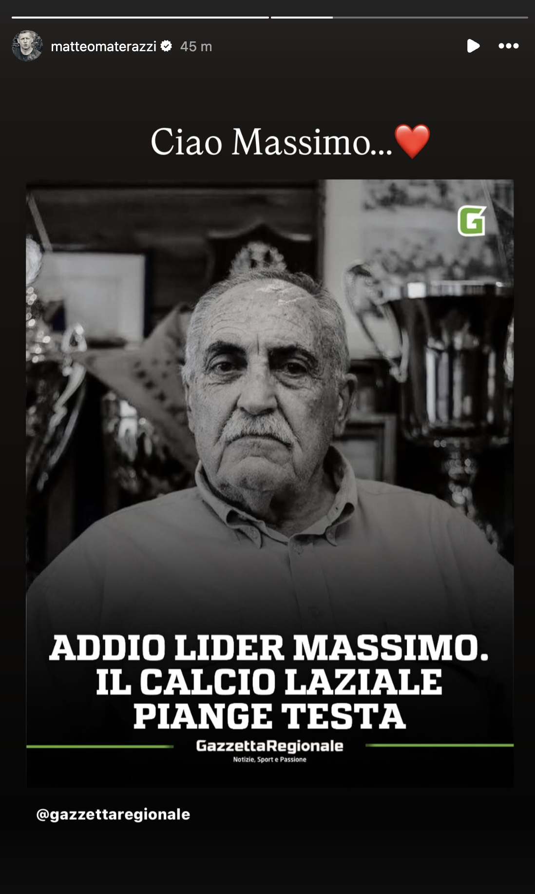 Con una storia sul proprio profilo Instagram, Matteo Materazzi, procuratore calcistico e fratello del campione del mondo Marco, cresciuto con il Tor di Quinto, e papà del calciatore della Lazio Gianfilippo ha ricordato il presidente Massimo Testa