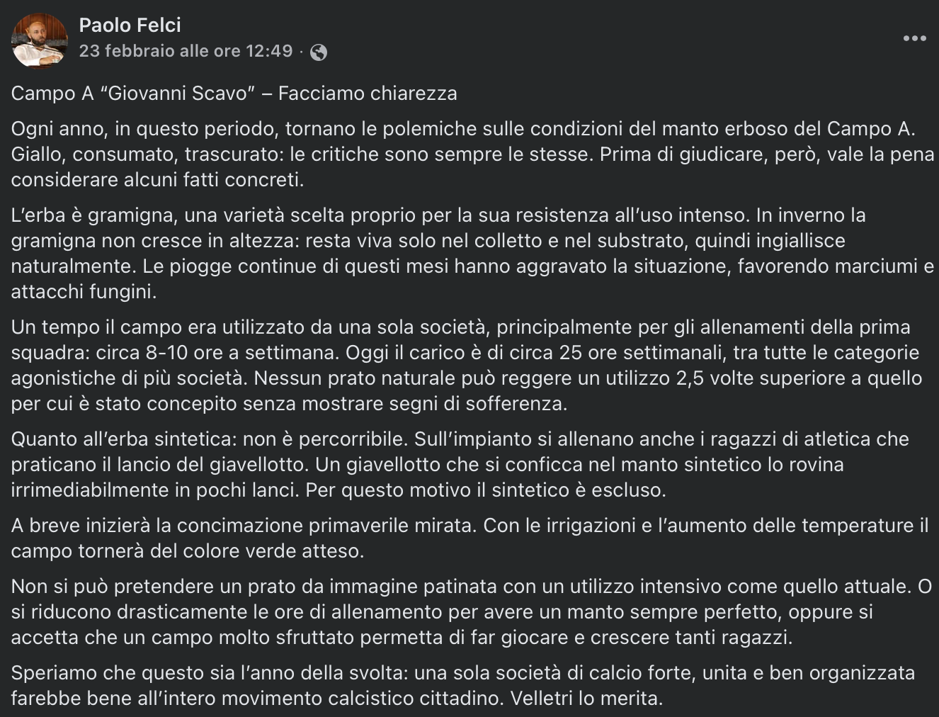 Condividendo l'analisi fatta dall'Assessore Paolo Felci in un post, ma sempre auspicando il rifacimento del campo, ritiene tuttavia inopportuna, in questa fase, la manutenzione prospettata con il fermo di un mese per gli allenamenti di Prima Squadra, Under 19 Juniores e tre gruppi dell'Agonistica. Ciò avverrebbe infatti in un momento topico per l'esito dei rispettivi campionati. Il club ritiene deleterio fare manutenzione poiché non c'è soluzione alternativa per gli allenamenti.