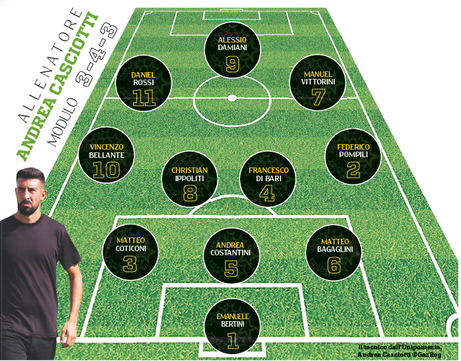 Un 3-4-3 a trazione anteriore: tre bomber più Bellante e Pompili. Al timone c'è Andrea Casciotti