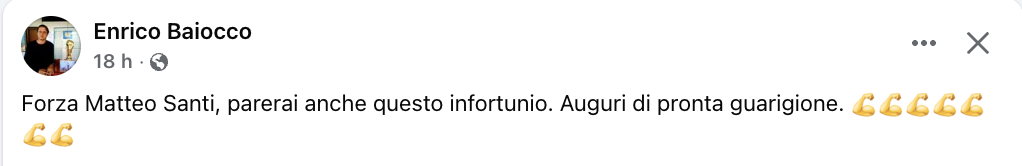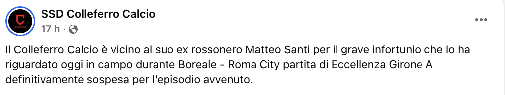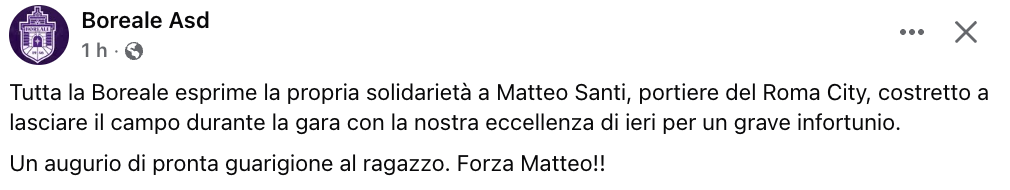 L'ultima non è stata una normale domenica di calco giocato. I risultati quasi passano in secondo piano di fronte al grave infortunio con cui ha dovuto fare i conti l'estremo difensore del Roma City, Matteo Santi, con la gara contro la Boreale che come noto è stata sospesa al 10' del secondo tempo. Tra ieri pomeriggio, ieri sera e questa mattina, sono stati diversi i messaggi di affetto per il portiere arancioblù apparsi sui canali social delle società dell'Eccellenza laziale e non solo. Messaggi di vicinanza e di pronta guarigione ai quali si unisce ovviamente anche la nostra Redazione. "Matteo, speriamo di rivederti presto in campo!"
