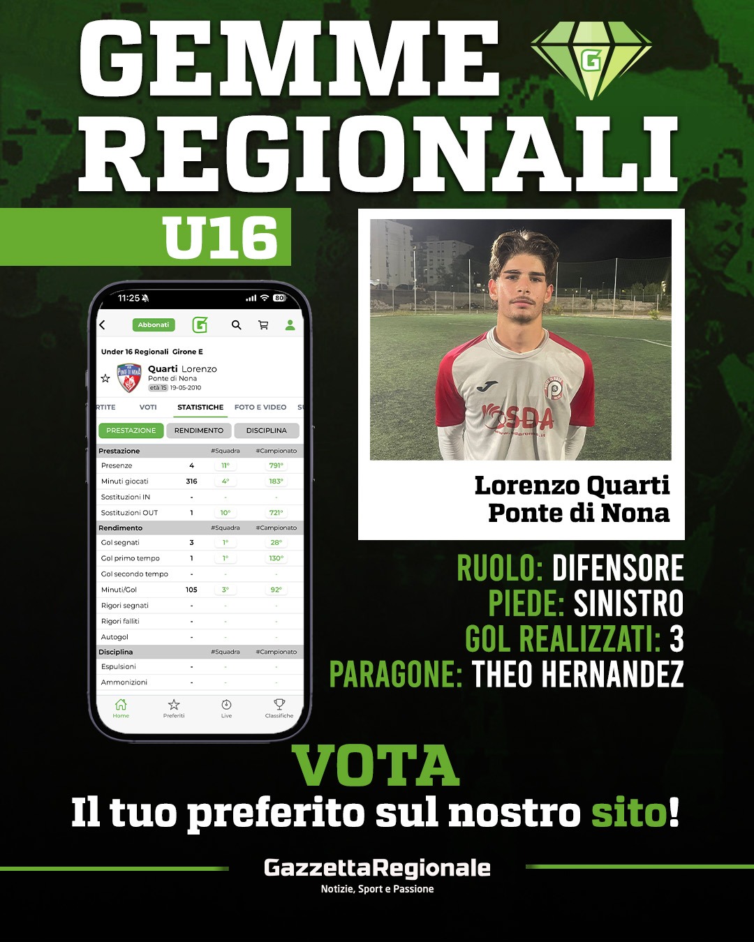 Tre gol nelle prime quattro partite, che sono coincise con tre vittorie ed una sola sconfitta, quella in casa del San Paolo Ostiense. Già protagonista nella scorsa stagione, ma ancor di più in quest'inizio di 2025-2026 dove con le sue scorribande sta facendo ancora la fortuna del Ponte di Nona. Parliamo di Lorenzo Quarti, terzino sinistro classe 2010, a segno per tre volte di fila, oltre che nel 3-2 già citato anche contro Alba Roma (vittoria per 3-1) e Ciampino, con uno 0-5 che non ha lasciato scampo agli aeroportuali. Il paragone che ne fa il suo tecnico è di quelli lusinghieri, ma ovviamente fatte le dovute proporzioni. Ossia Theo Hernandez, ex Milan ora in Arabia Saudita.