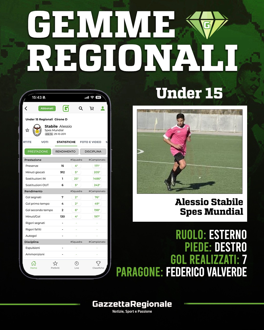 Vittoria interna per la Spes Mundial, domenica scorsa, che nella sua tana ha sconfitto per 3-1, l’Atletico Lariano anche grazie ad una splendida doppietta di Alessio Stabile. Esterno classe 2011, piede preferito il destro, gioca indifferentemente alto o basso a seconda delle preferenze del tecnico Andrea Bimonte. Sono ben 7 i gol realizzati sinora, quota notevole visto il ruolo. Bravo negli inserimenti il paragone fatte le dovute proporzioni è con Federico Valverde.