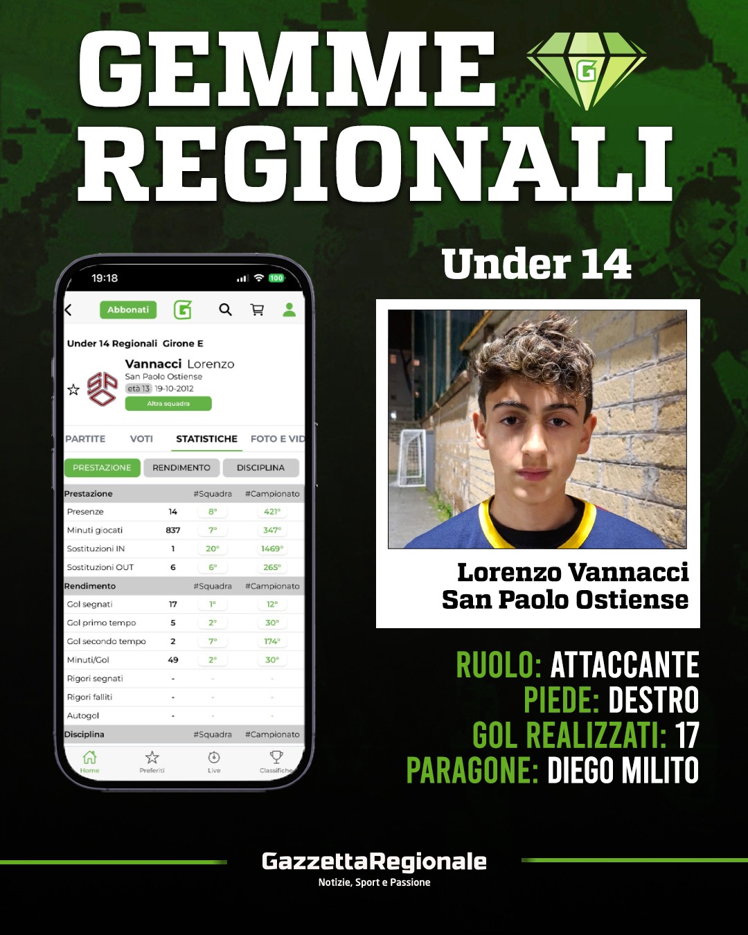 Sono ben 17 i gol stagionali realizzati sinora da Lorenzo Vannacci, splendido attaccante classe 2012 del San Paolo Ostiense. Ultimo dei quali la scorsa domenica, decisivo nella trasferta vinta per 0-1 contro l'Acquacetosa. Per lui anche una presenza ossia 28 minuti in Under 15 Elite contro l'Atletico Lodigiani, mentre i gol consecutivi sono ben 4, tra le 3 gare disputate in questo gennaio 2026 e l'ultima di dicembre 2025. Destro di piede, abbina fisico e qualità, il paragone fatte le dovute proporzioni è con Diego Milito.