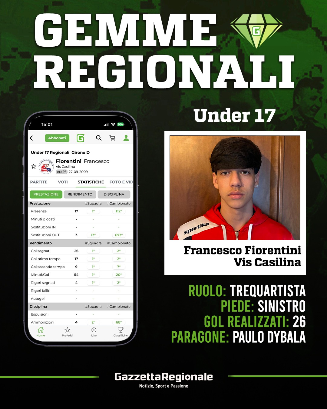 Sono 26 i gol messi a segno su 17 gare disputate, secondo nella classifica marcatori solo a Pontecorvo del Valmontone. Francesco Fiorentini della Vis Casilina anche la scorsa domenica nel 6-1 sull'Atletico Veroli dei rossoblù di Buson è stato protagonista con una doppietta personale, la terza in 4 partite, soltanto perchè con il Frassati Anagni fanalino di coda ne ha messo a segno 4 con una sola gara. Di piede sinistro, trequartista che sa ovviamente attaccare bene la porta, partendo dall'esterno. Il paragone è con Paulo Dybala.