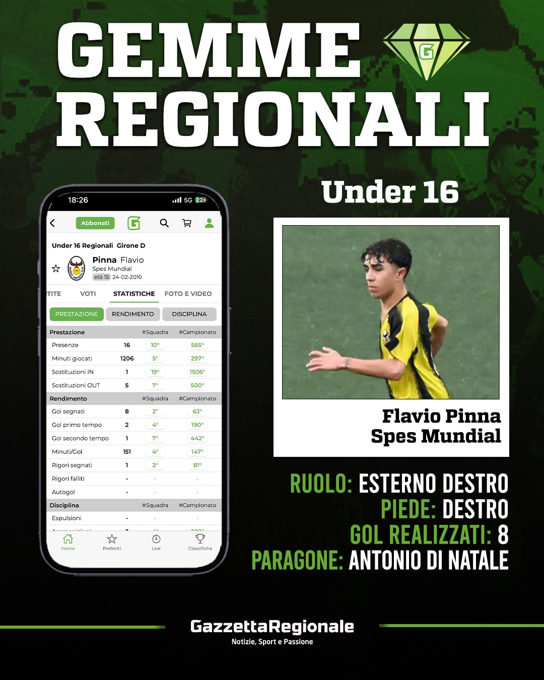 Terzo elemento della Spes Mundial di Emanuel Consiglio, capolista del girone D con 3 punti di vantaggio sul Monti Prenestini e 4 sulla coppia composta da Lupa Frascati e Sora. Parliamo di Flavio Pinna, esterno classe 2010 fin qui protagonista con ben 8 gol, ultimo dei quali sabato scorso contro l'Atletico Lariano, 2-0 in cui è andato a segno anche Ingami. Tornando a Pinna, si tratta di un esterno di piede destro, veloce e agile, con una buona qualità nel dribbling. Calciatore freddo e deciso sotto porta, bravo nel lavorare anche ovviamente in fase difensiva, proteggendo la sfera. Il paragone è con Antonio Di Natale.
