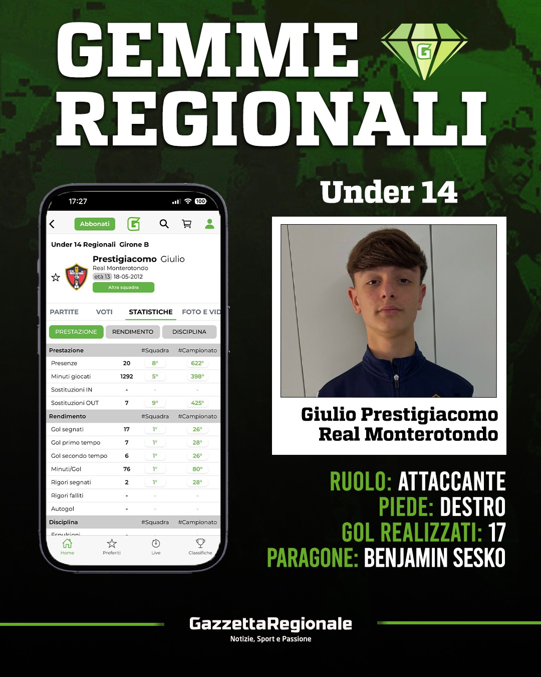Il Real Monterotondo ha trovato in Giulio Prestigiacomo il terminale offensivo ideale per un calcio moderno che richiede sacrificio e qualità. Con uno score di 17 reti in 20 presenze, l'attaccante sta dimostrando una continuità realizzativa impressionante, figlia di un mix raro tra struttura fisica e agilità. Prestigiacomo non è il classico centravanti d'area che attende il pallone: la sua dinamicità lo porta a svariare su tutto il fronte d'attacco, fungendo da primo difensore e aiutando i compagni nella risalita del campo.