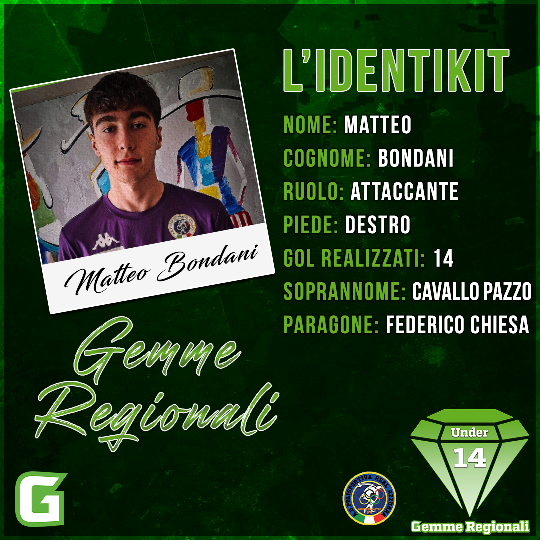 Dietro l'ottima stagione prodotta sinora dalla Real Azzurra Etruria, tra i classe 2011, attualmente ottava in classifica all'interno del girone A con 10 punti, dopo il 6-1 casalingo inflitto al Palocco fanalino di coda, c'è anche un certo Matteo Bondani. Esterno destro d'attacco o seconda punta, spesso chiamato in causa anche dall'Under 15 di Burla. Destro di piede, con tecnica e ampi margini di crescita, avendo iniziato a giocare effettivamente a calcio soltanto lo scorso anno a 11. Sono stati sinora 14 i suoi gol stagionali, niente male visti i 27 totali della sua squadra. Da affinare vista ovviamente la giovanissima età, ma con un rendimento che finora è stato decisamente sopra la righe. Denominato cavallo pazzo all'interno della sua squadra da compagni e allenatori, ricorda un primissimo Federico Chiesa, quello degli esordi con la maglia della Fiorentina.