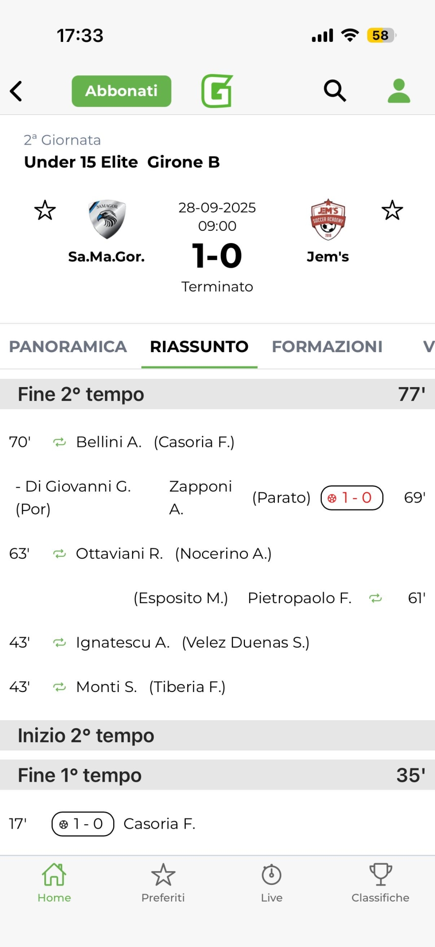 La Samagor gioisce per la prima volta e lo fa superando di misura in casa la Jem's. A segnare il gol da tre punti è Casoria ma sulla vittoria ci sono anche le manone di Giulio Di Giovanni. L'estremo difensore nerazzurro è sempre attento tra i pali, mantiene la porta inviolata e soprattutto si esalta al 30' della ripresa, quando vola e neutralizza il rigore di Zapponi. Saracinesca.