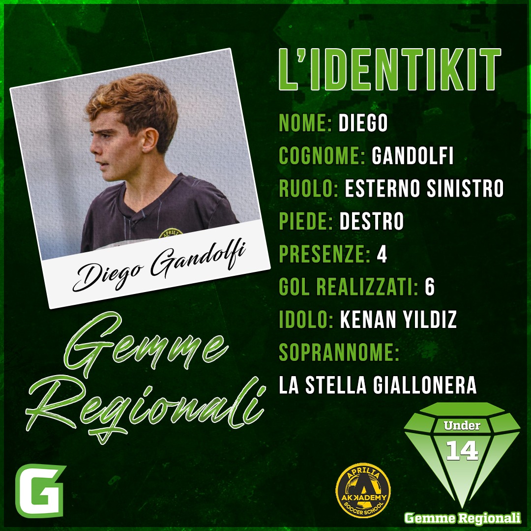 Tra le più belle sorprese di questo inizio di stagione, per quanto concerne il campionato Under 14 regionale, sicuramente si staglia tra le altre, quanto meno per il girone C, l'Akkademy Aprilia merita un posto particolare. Tre le vittorie conseguite sulle quattro partite disputate, compresa l'ultima con un poker interno inflitto al Pomezia. La formazione giallonera guidata da un totem come Raffaele Triola, promette di ritagliarsi uno spazio importante, visto il tenore del tecnico che allena i classe 2011 e la qualità che sicuramente è al centro dell'attenzione. Tra gli altri sin qui ha spiccato Diego Gandolfi, autore sin qui di 6 reti, che lo collocano in vetta alla classifica marcatori insieme a Contu, Loy, Regis e Zavadini. Nasce come centrocampista, interno o mezza punta ma per necessità quest'anno copre l'esterno sinistro offensivo pur essendo un destro. Molto duttile, anche se proprio in quest'annata ha trovato la sua collocazione probabilmente preferita. Nonostante non abbia un fisico robusto è un giocatore dal gran temperamento e le sue abilità tecniche abbinate alla sua capacità di inserimento promettono diversi gol per lui nell'arco dell'annata. Paragone importante ma giovane, come quello con Kenan Yildiz.