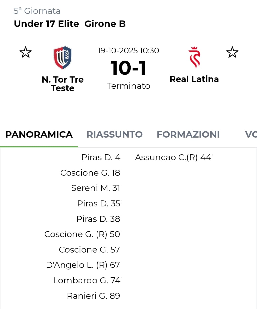 La Tor Tre Teste dilaga sul Real Latina per 10-1 e trova la prima vittoria in campionato. Protagonisti in assoluto, Piras e Coscione che, con le loro triplette, hanno spalancato le porte del successo. La prestazione messa in campo dalla squadra di Riccardo Neri fa ben sperare per il proseguimento della stagione.