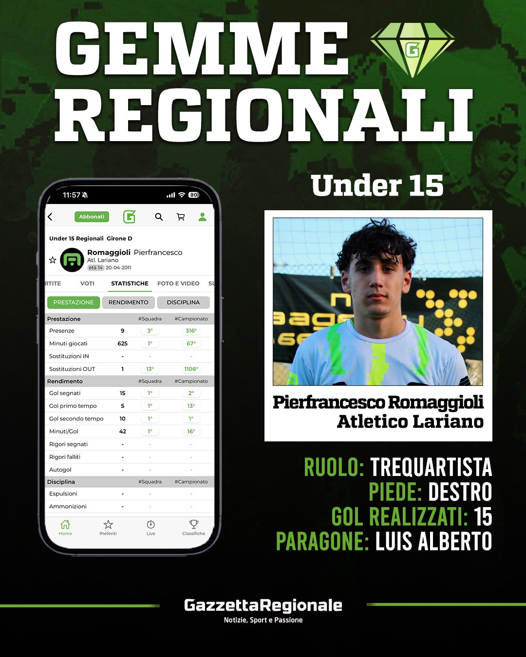 26 gol totali realizzati dall'Atletico Lariano di Davide D'Auria. Ben 15 portano la firma di Pierfrancesco Romaggioli, tre-quartista dalle notevoli doti tecniche, della compagine gialloverde, salita a quota 10 punti dopo il successo sul Tor Sapienza e a +7 sulla zona a rischio. Destro di piede, fa ovviamente della fantasia la sua arma migliore, già lo scorso anno si era messo in luce in Under 14, mentre nella stagione in corso vanta anche una presenza da sotto-età con l'Under 16 in quel di Frascati. Il tutto ovviamente aiutato dai propri compagni. Il giocatore al quale si ispira è Neymar, per il paragone invece è quello con Luis Alberto.