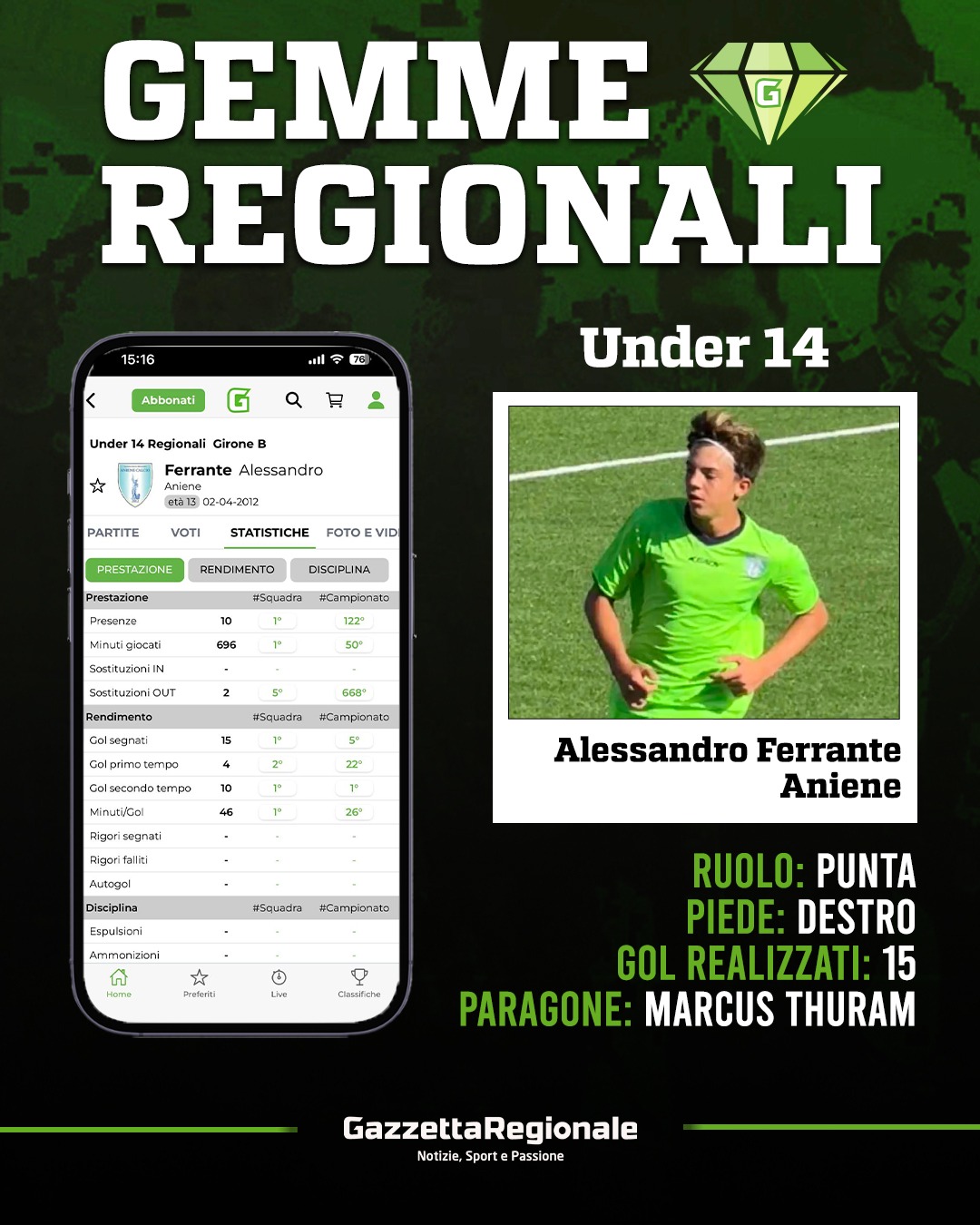 Sola in vetta alla classifica, 30 punti raccolti su 10 giornate, punteggio pieno e una favola che non smette di stupire. L'Aniene sta diventando grande, con 30 gol fatti e 11 subiti, la compagine biancoceleste vanta Alessandro Ferrante, attaccante, punta di riferimento della formazione allenata da Attilio Nonni, doppietta sabato scorso contro l'Achillea. Sono state 15 sin qui le sue realizzazioni, di cui 9 nel secondo tempo. Nel complesso tre doppiette ed una tripletta il 29 novembre contro l'Athletic Soccer Academy. Grande abilità nel saltare gli avversari, destro con un buon tiro, per le caratteristiche tecniche (fatte le dovute e ormai ovvie proporzioni), il paragone scelto è con Marcus Thuram.