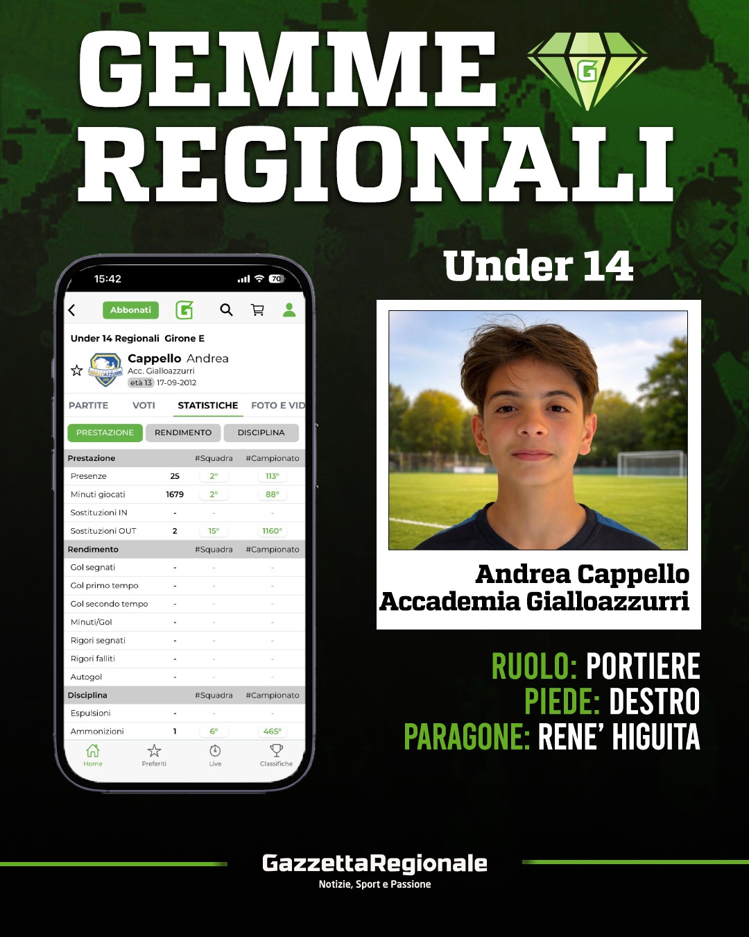 Nell’Under 14 dell'Accademia Gialloazzurri sta emergendo un profilo che ruba l’occhio per personalità e stile di gioco: Andrea Cappello. Portiere moderno, destro di piede, Cappello fa della reattività e dell’esplosività i suoi marchi di fabbrica. Non è il classico numero uno che si limita a restare sulla linea di porta; Andrea è un estremo difensore coraggioso, capace di guidare la difesa con autorità e di prendersi rischi calcolati nelle uscite e nel gioco con i piedi.