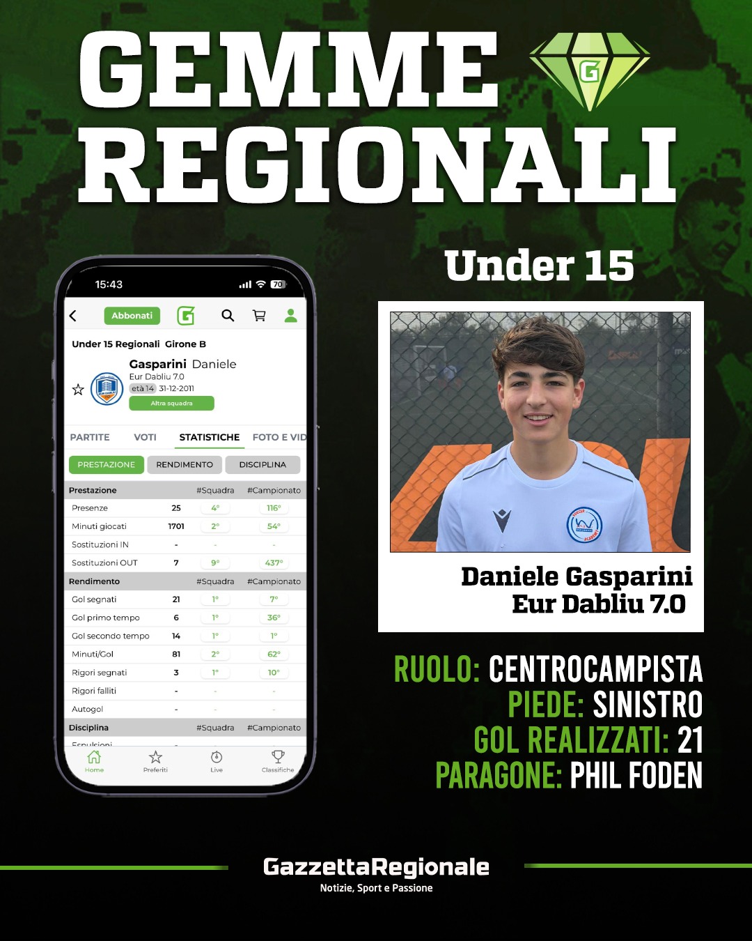 Se l’Eur Dabliu di Gianluca Macioce vola nei piani alti della classifica Under 15, gran parte del merito va a Daniele Gasparini. Centrocampista dal mancino vellutato, Gasparini indossa la maglia numero 10 con una naturalezza disarmante, onorandola con numeri da capogiro: ben 21 i centri stagionali messi a segno finora. Nonostante parta dalla zona mediana del campo, la sua capacità di inserimento e il fiuto per il gol lo rendono un attaccante aggiunto, la vera punta di diamante della formazione capitolina.