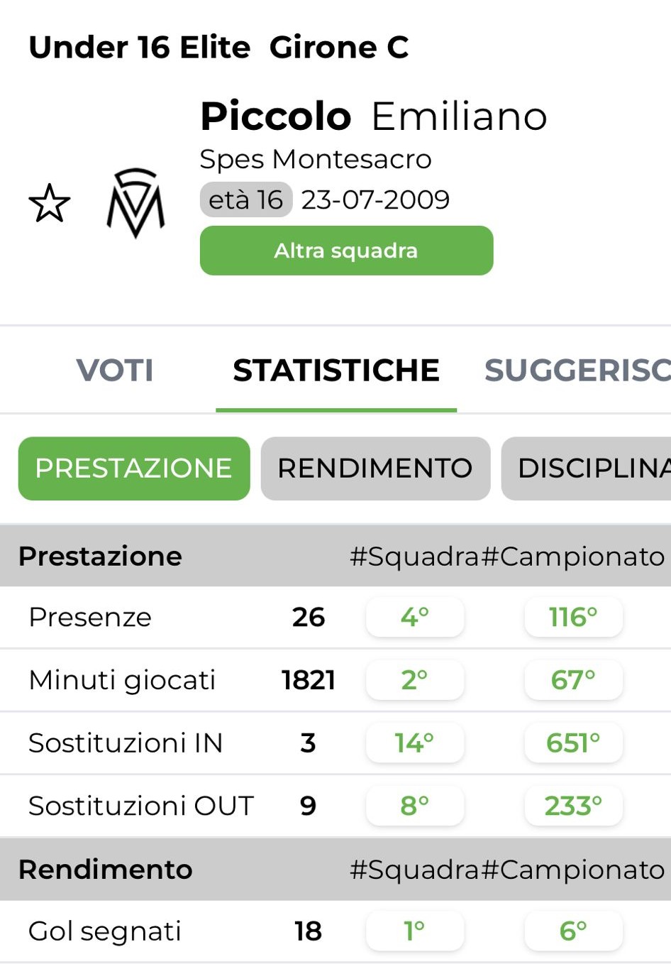 L'attaccante disputerà il campionato Under 17 Serie C con la maglia rossoverde, dopo un'annata la scorsa condita da 18 centri su 26 partite nel girone C, con Spes Montesacro che si è classificata al secondo posto, alle spalle della Romulea. Per lui anche una doppietta nel 1° turno dei play off (con sconfitta ai calci di rigore) contro la Lodigiani.